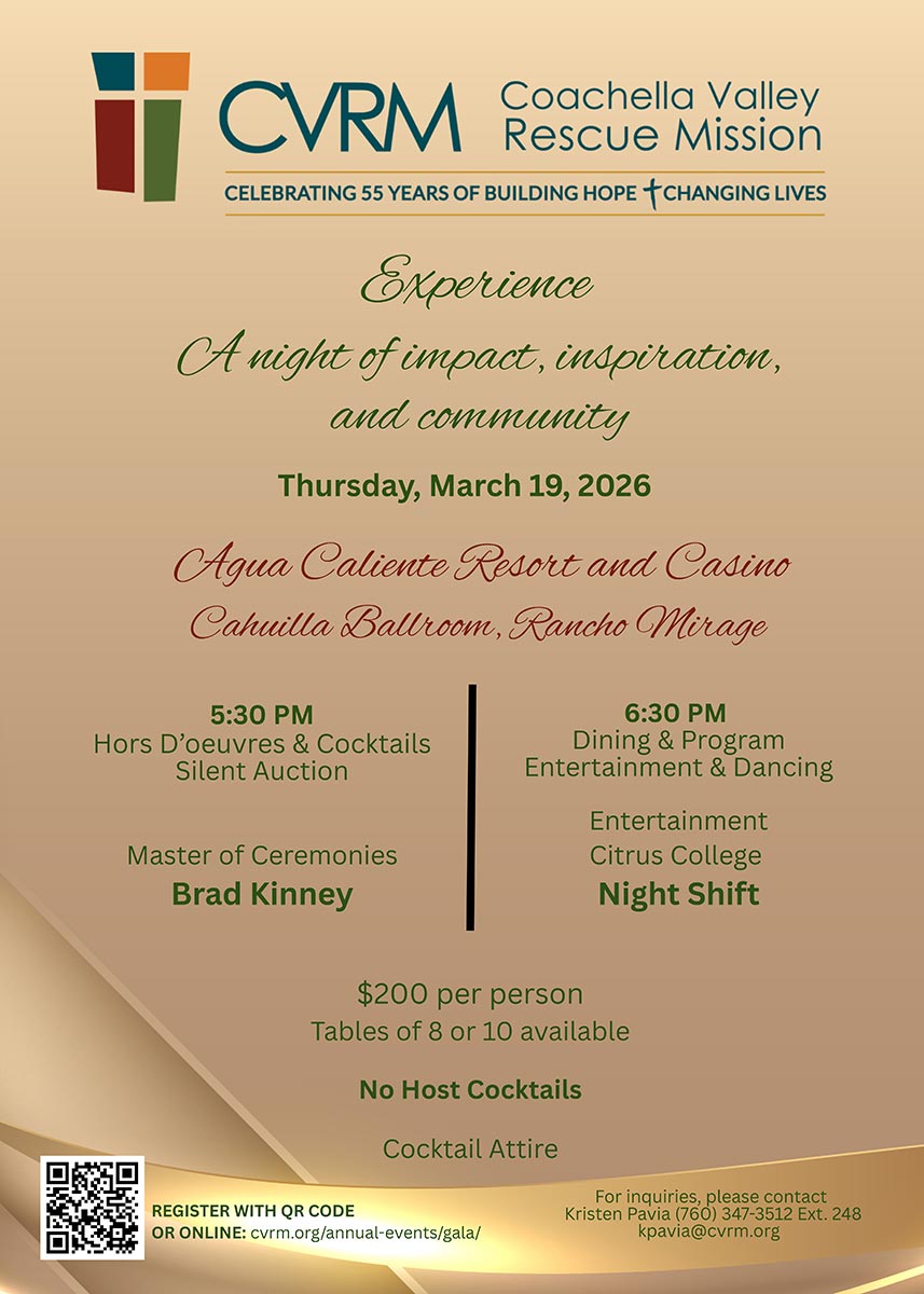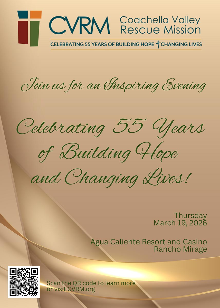 Coachella Valley Rescue Mission is excited to share the details of our 55th Anniversary Gala, and we hope that you will join us!